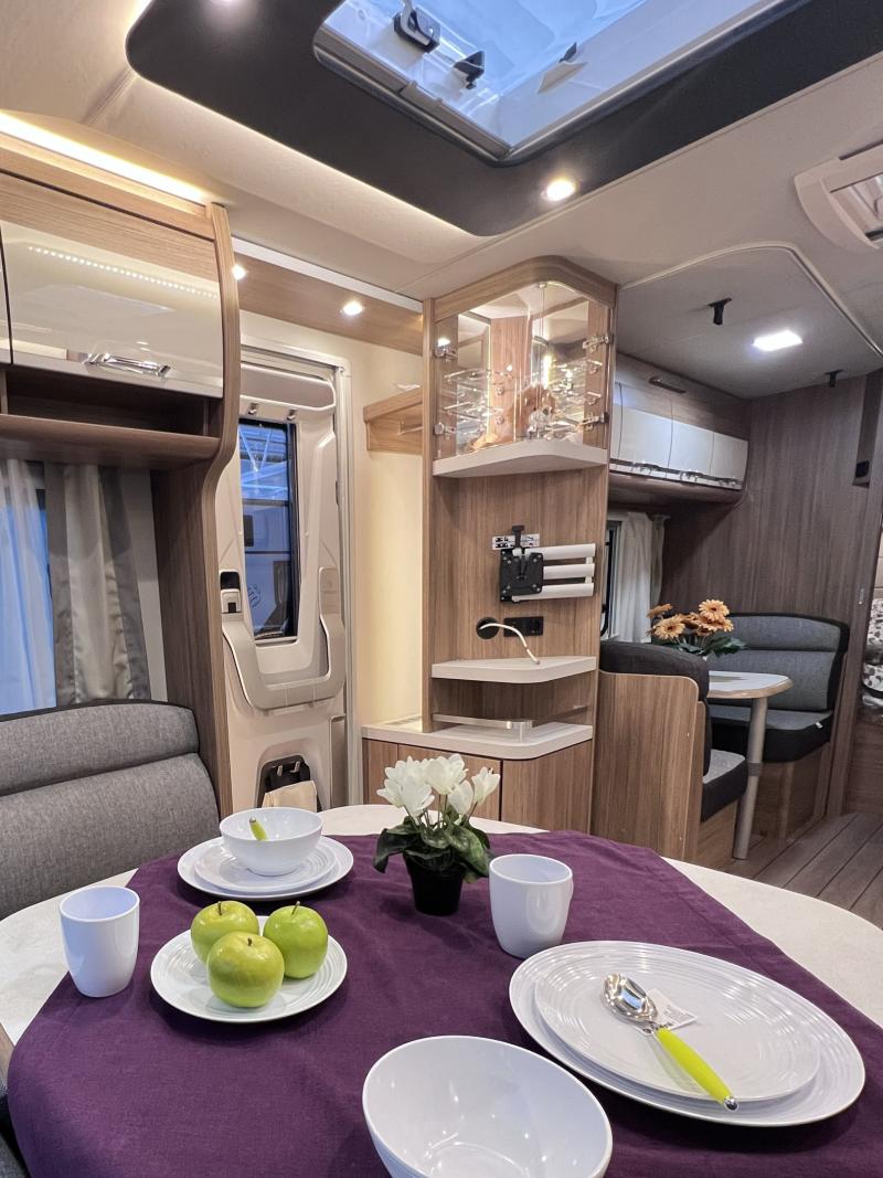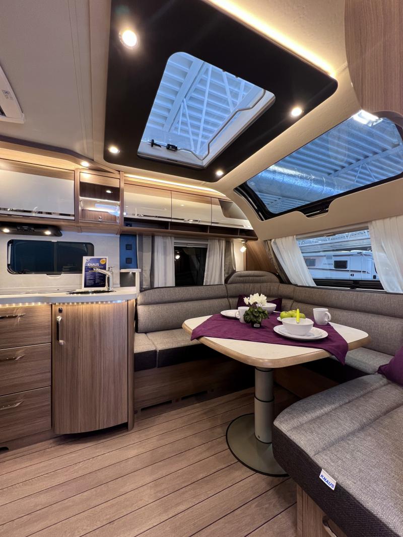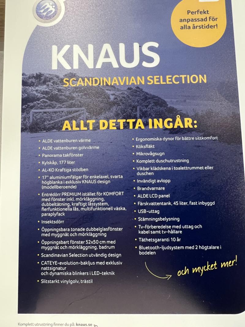 ALDE vattenburen värme, ALDE vattenburen golvvärme, Panorama takfönster, Kylskåp 177 liter, AL-KO kraftiga stödben, 17" aluminiumfälgar för enkelaxel, svarta högblanka i exklusiv KNAUS design (modell beroende), Entrédörr PREMIUM istället för KOMFORT med fönster inkl. mörkläggning, dubbel tätning, kraftigt låssystem, fler funktionella lås, multifunktionell vaska, paraply fack, insekts dörr, Öppningsbara tonade dubbelglasfönstermed myggnät och mörkläggning Öppningsbart fönster 52x50 cm med myggnät och mörkläggning, badrum Scandinavian Selektion utvändig design CATEYE-evolution-bakljus med exklusiv night signatur och dynamiska blinkers i LED-teknik, Slitstarkt vinylgolv, trästil, Ergonomiska dynor för bättre sittkomfort, Köksfläkt, Mikrovågsugn, Komplett dusch utrustning, Vikbar klädskena i toalettrummet eller duschen, Invändigt avlopp, Brandvarnare, ALDE LCD panel, Färskvatten tank, 45 liter, fast inbyggd, USB-uttag, Stämningsbelysning, Tv förberedelse med uttag och kabel samt tv-hållare, Täthetsgaranti 10 år, Bluetooth-ljudsystem med 2 högtalare i bodelen,